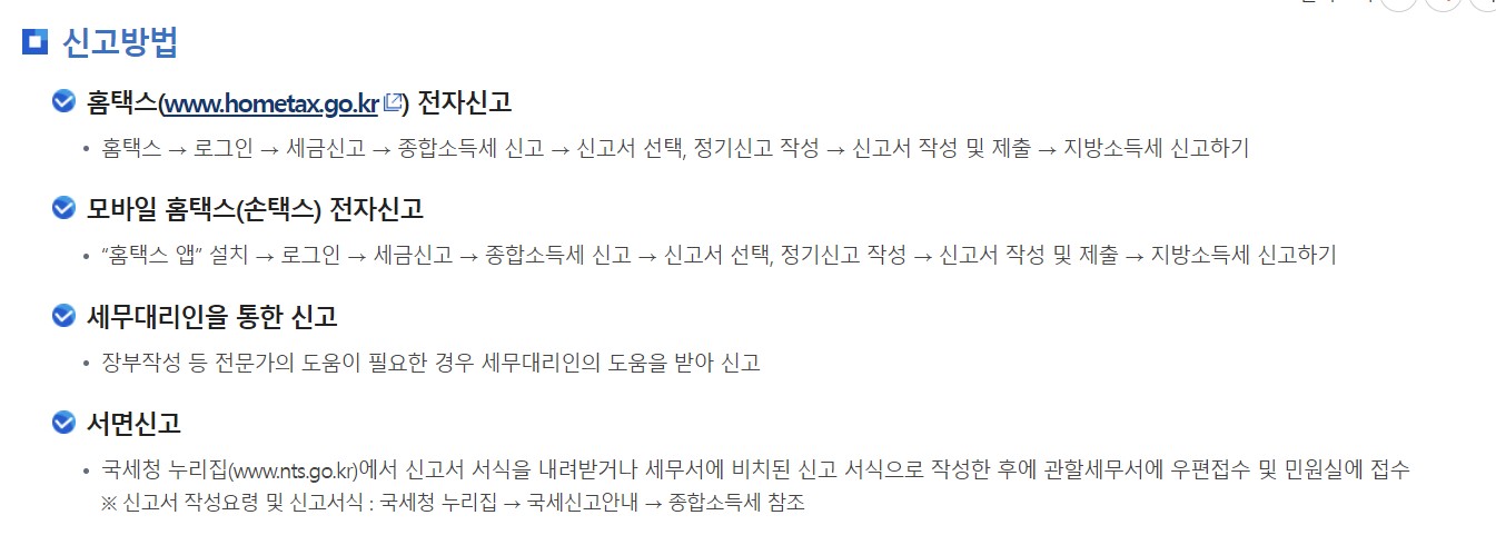 종합소득세를 신고할 때는 홈택스, 손택스, 세무대리인, 또는 서면신고를 통해 신고할 수 있습니다. 기한을 지키지 않을 경우 무신고에 해당하여 가산세가 20프로 부과되며, 최대 6개월 이내에 신고할 경우 가산세 감면이 가능합니다. 1개월 일경우는 50% 3개월은 30*% 6개월은 20%의 가산 세가 붙으니 서둘러 신고 하시는 것이 좋습니다. 또한, 계속해서 종합 소득세를 신고하지 않는다면 임의로 소득이 잡혀서 세금 부담이 커지고 의료 보험료도 올라가게 되니 주의 하셔야 합니다